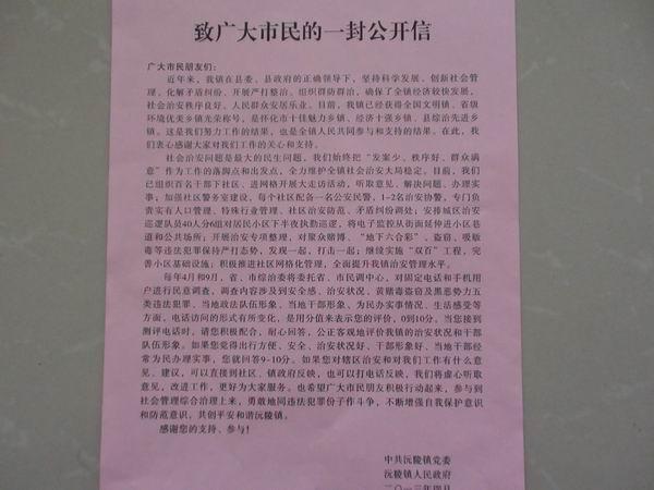 在大走访过程中,始终注重宣传引导,让广大市民从内心深处对创建省级平安县、对如何加强社会管理创新工作有一个全新的认识和了解,并使其积极参与其中。为了加大宣传力度,营造浓厚的宣传氛围,镇政府印发2万份社会管理综合治理宣传手册,发放到居民手中;在城区街头巷尾人员来往密集的主要地段,以及物业小区、部分单位宿舍区、车站、码头、市场等重要地段钉挂了100余块宣传牌;向城区9所学校的2万名中小学生发放了2万封“致广大市民的一封公开信”,要求学生将“公开信”带回各自家中,呈送给家长阅读。目前,该镇平安创建工作宣传氛围浓厚、家喻户晓。