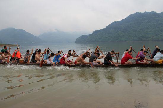 40余名男丁从船屋将龙舟迎接出来,在围观群众的簇拥下浩浩荡荡将龙船抬向码头。传统的祭祀仪式后,在鞭炮和呐喊声中,桡手们将龙船连同鼓手一起举起抬向江中,并迅速从两旁纷纷爬上龙船,齐力将龙舟离弦箭一般划向江心。下水后的龙舟首先到深溪乌龙潭拜码头,整个下水仪式才算正式结束。