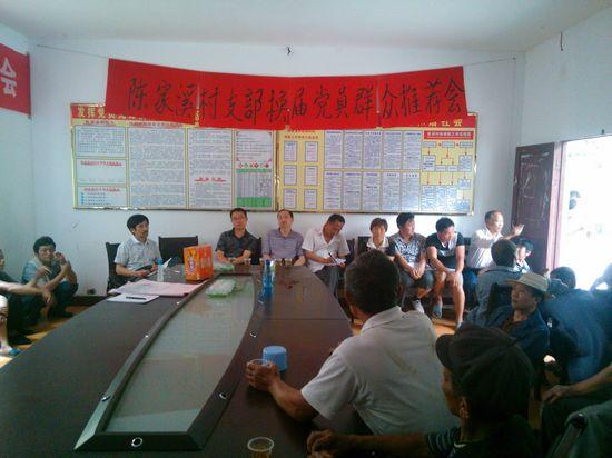 本次换届推荐会由该村村主任孟翠英主持,村党支部黄春生就上届村党支部工作作了全面的述职,指导组成员李爱国宣读了《明溪口镇村(社区)党支部换届工作实施方案》,镇长邓忠习就换届工作作了重要讲话。通过党员推荐投票,群众信任度测评,产生了新一届陈家溪村党支部初步候选人。