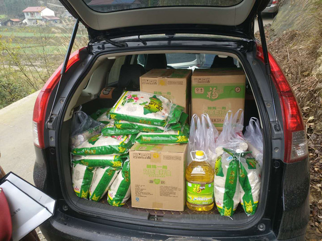 在楠坪村,县人防办干部职工翻山越岭为贫困户送去了油、大米、面条等生活物资,并对照“政策明白卡”宣讲扶贫政策。