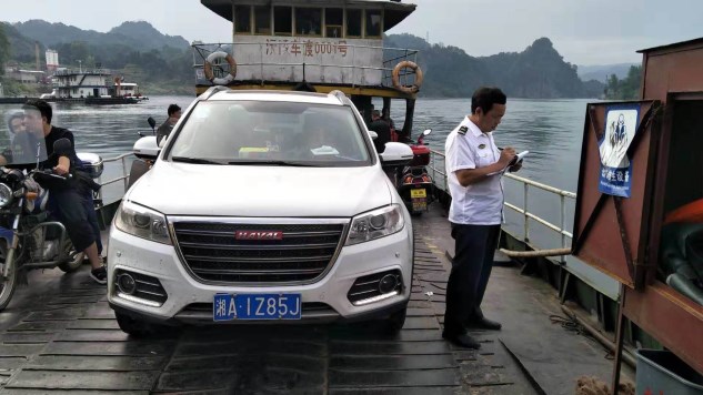 在五强溪镇,身着白色制服的县地方海事处工作人员登上“沅陵车渡0001号”,对船舶的消防、救生设备及船体适航状况进行检查,以确保安全。