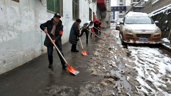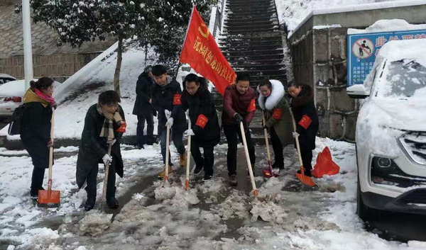 梅花欢喜漫天雪,傲雪寒梅惹人怜。12月29日晚上开始,一场暴雪,沅陵大地银装素裹,给群众通行带来极大不便。为此,沅陵镇廻龙山社区21名党员干部自发组成志愿者,到各组路段铲雪除冰,疏通路面。他们以此作为党员主题日活动,先后铲除了沅水桥下至河边码头、车站组至田家巷陡坡易滑路段的积雪,并在易滑的路面上撒盐除冰。在一天的时间里,党总支部的红旗在雪地上飘扬,带着红袖章的志愿者们,挥动着铁铲,让寸步难行的路面恢复了正常通行,过路行人纷纷点赞。