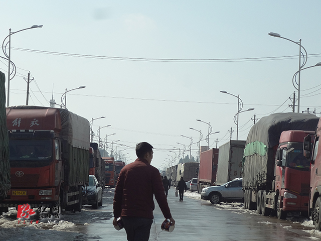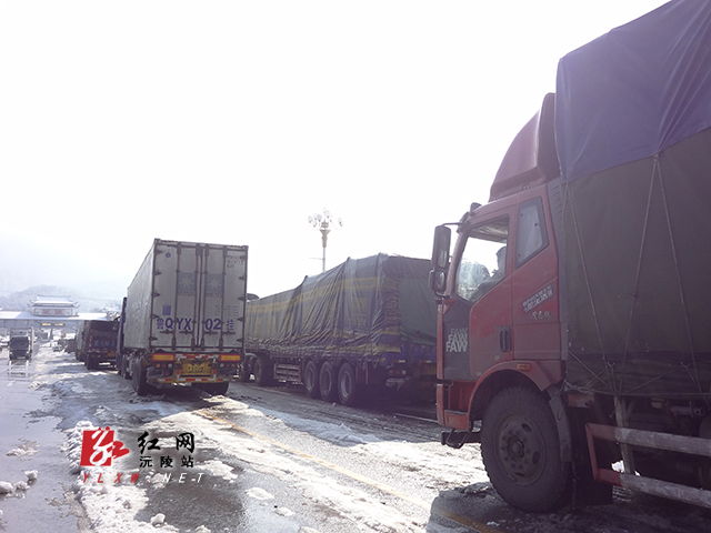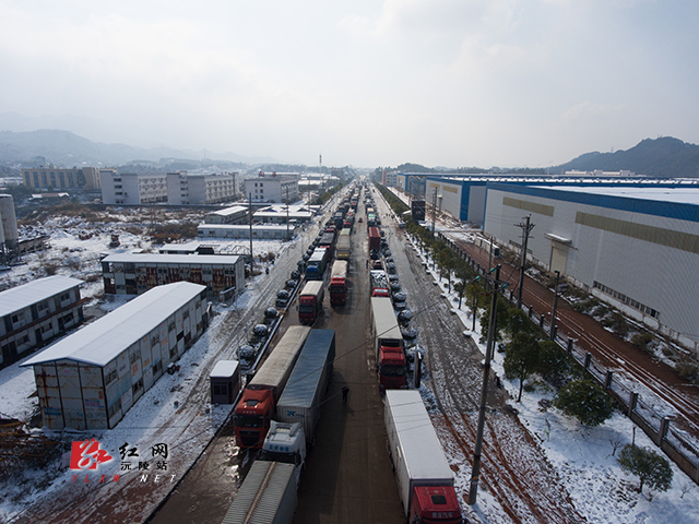 12月31日下午2点10分,常瑞高速湖南沅陵出口,一台台满载货物的重型卡车鱼贯而入,半公里长的工业园大道两旁,排成了两条车队长龙。