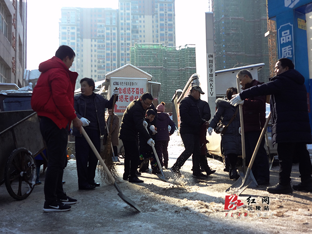 沅陵新闻网讯(记者 邓永松) “叮叮当当”“哧哧嚓嚓”“嗨哧嚯哧”,2018年最后一天大清早,走近沅陵城乡,到处都是机关和企事业单位党团员、干部职工在公路、街头、社区、村居、集镇挥舞铁铲、锄头、扫帚清雪除冰的身影,为过往车辆和行人打通安全通道。