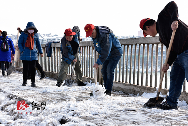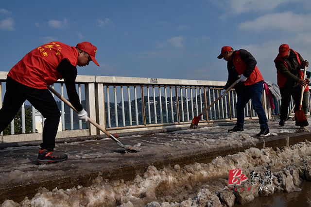 桥长冰厚,清障缓慢。下午1点左右,团县委一声号令,城区辰州公益、青年创业者协会等社会组织50多名志愿参加大桥积雪冻冰清除大会战,一时间整座大桥尽是“小红帽”“蓝马甲”。