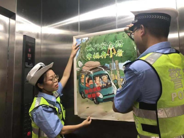 民警通过向社区群众发放宣传资料,宣传无牌无证、酒后驾驶、驾乘摩托车不带安全头盔的危害性和法律责任;在社区人员密集的小区广场、商场、饭店等电梯出入口张贴宣传海报,警示市民严格遵守交通法规,杜绝不良的驾驶习惯,做文明交通的践行者。