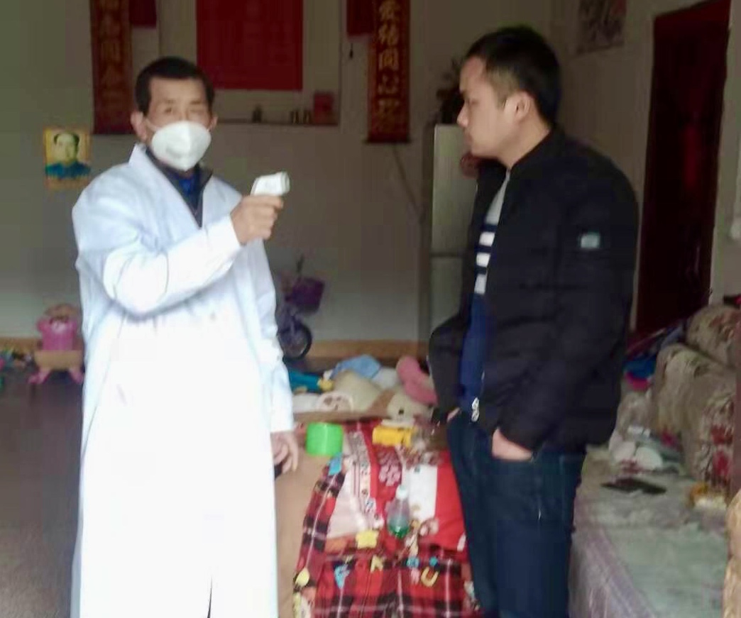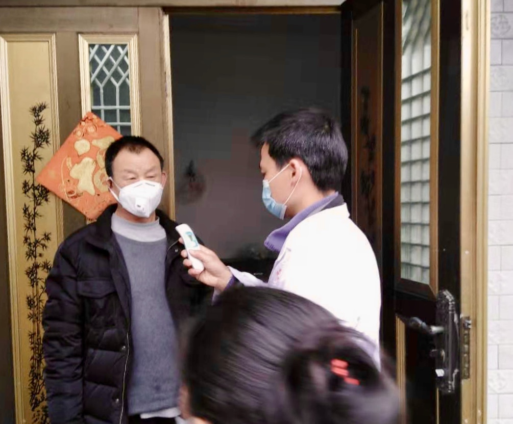 “到屋里啊?来,先量一下体温!关键时期,不要出门啊,把口罩要戴好起来!”2月14日一大早,村医欧家涛和李辉就来到居家隔离的村民家中,边测体温,边不厌其烦的交待着已经重复好多遍的话。