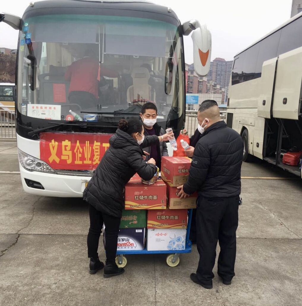 从2月21日起,该镇近50名浙江义务返岗务工人员经过信息登记、体温检测,分批分次全部登上了复工专车,出发前往浙江义乌。工作人员还贴心地为大家准备好方便面、卤蛋、矿泉水等食品,提供从家乡到务工地点的“一站式”服务,确保外出务工人员安全、健康返岗。